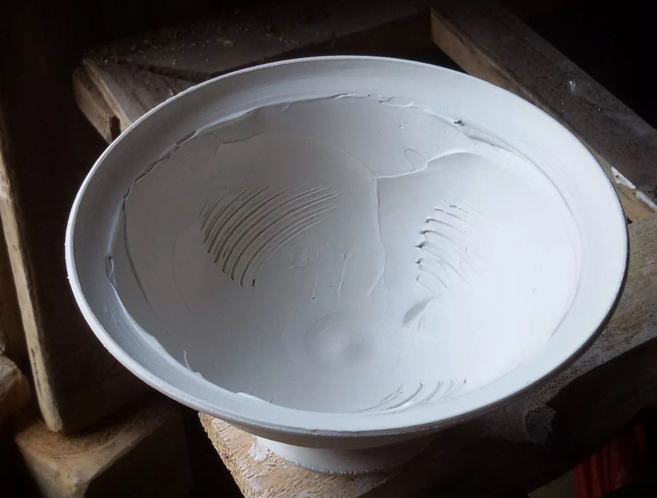 “风行水上”系列的灵感源于宋代的瓷片,宋瓷的装饰方式以阴刻手法为主。这种手法在五楼的陶瓷创作过程中,演变成新的形态:在一定湿度的坯体沾上泥浆,用依据不同器形自制的刮擦工具刮出纹理,形成围绕在陶瓷器上有节奏的刻画。