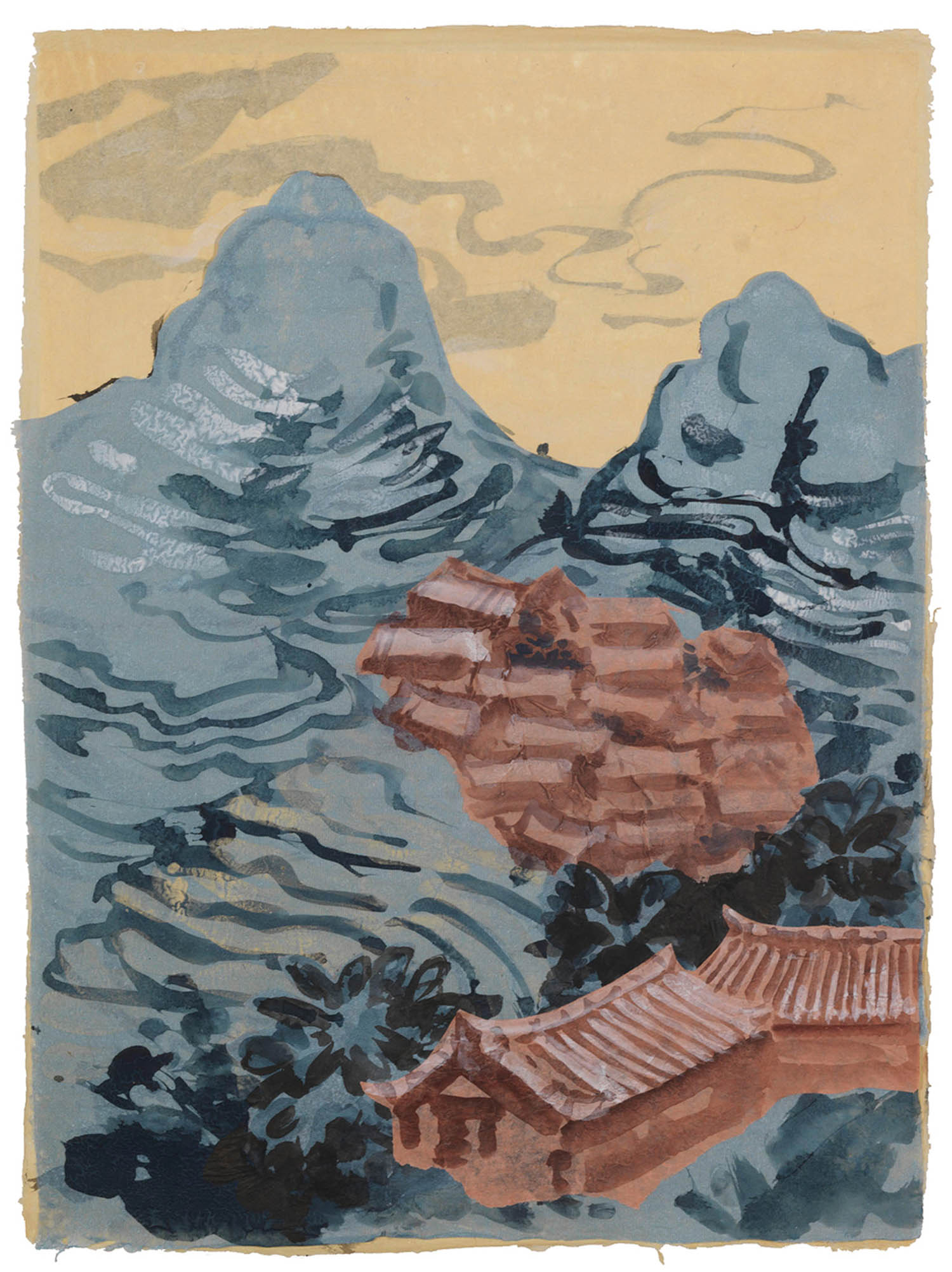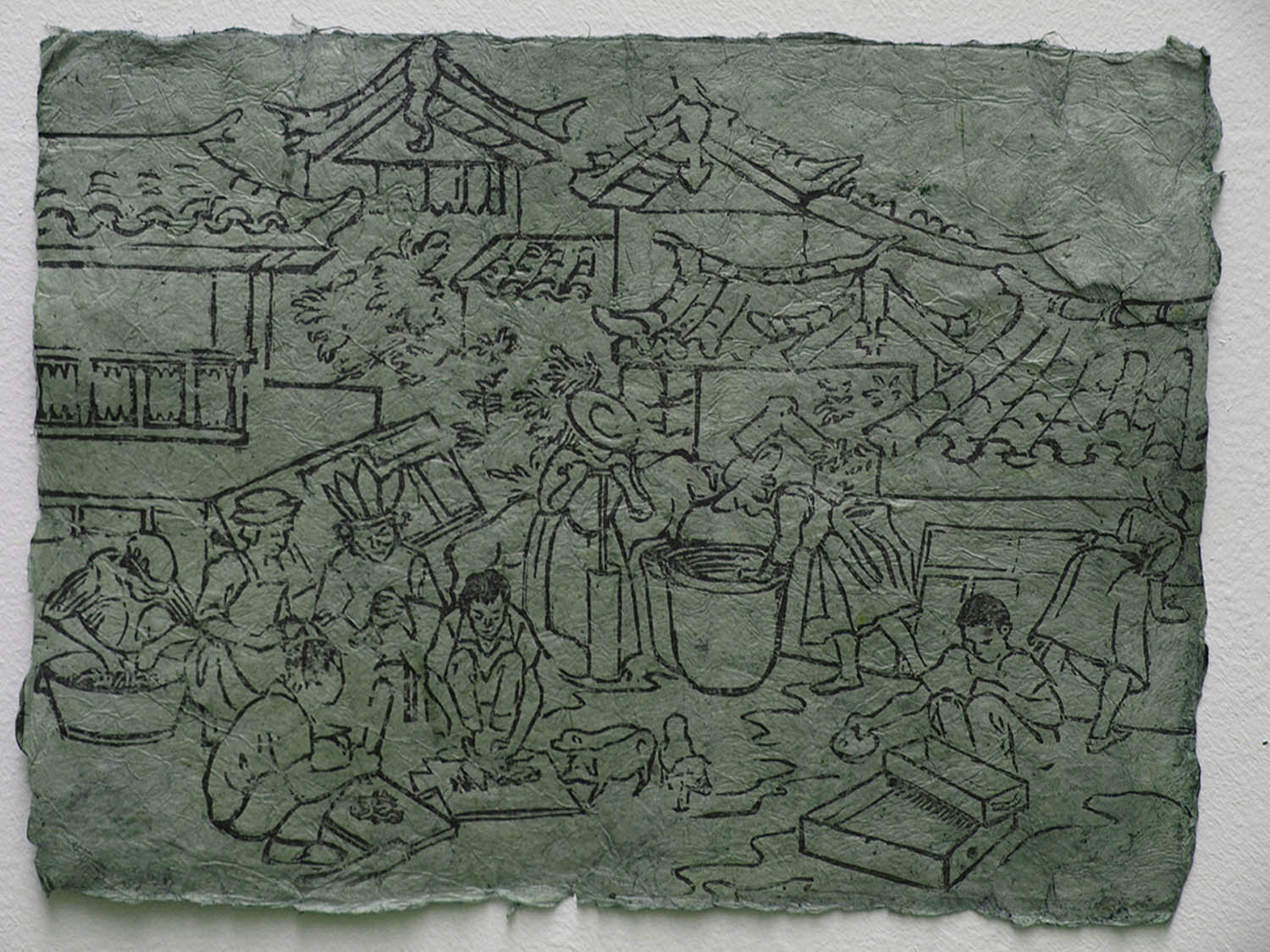 木刻版画,印于农场收获的靛蓝所染色的东巴纸上