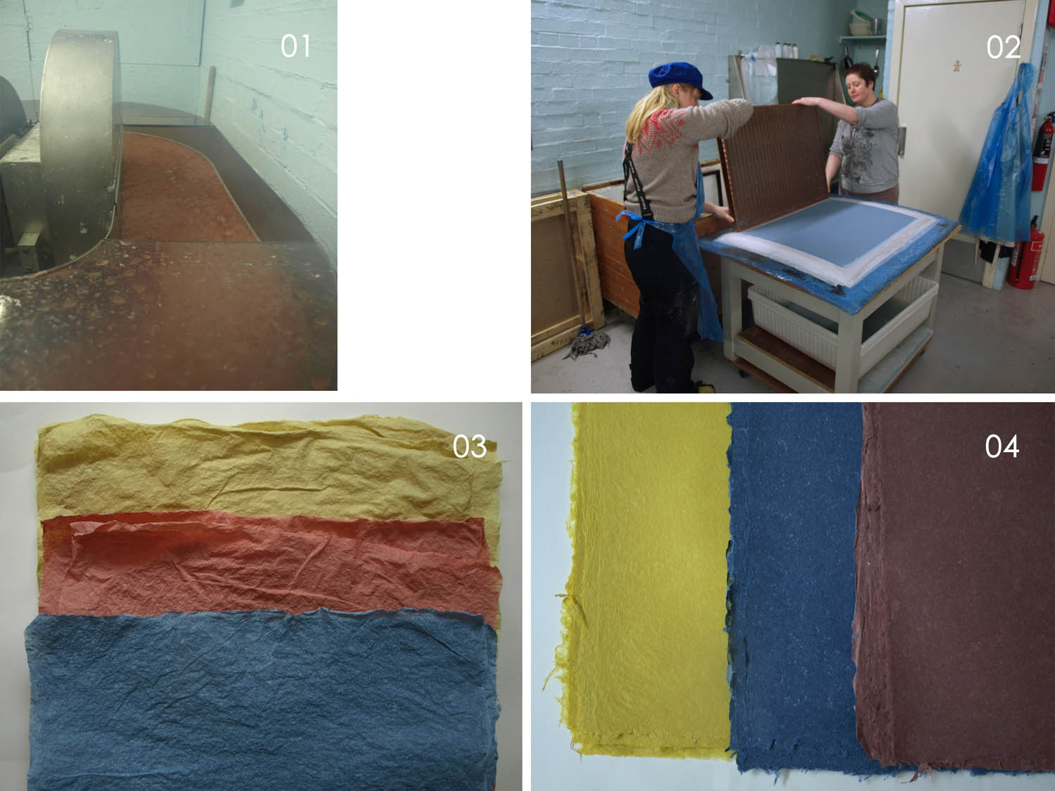 经过数月的实验和染色工作,我已准备好将我的“药染”碎布变成纸张。为此,我不得不前往格拉斯哥,拜访艾莉森·纽曼的Pulp纸张艺术工作坊。整个英国,只有在她的工作坊里,其他艺术家可以使用其中的设备,并可以向她请教专业知识,制造自己的纸张。我想制作大张的纸,因此我需要一个可以合作的人,还需要大型发酵缸、模具和压纸工具。不过我首先需要一台荷兰式打浆机将碎布打成纸浆。在云南造东巴纸的时候,这一过程可以通过用手敲打植物纤维完成,而欧洲的造纸方法则需要借助机械。17世纪,荷兰人发明的一种风能打浆机则大大提高了这一过程的效率。现在荷兰式打浆机在设计上几乎没有改变,只是将风能变为了电力驱动。