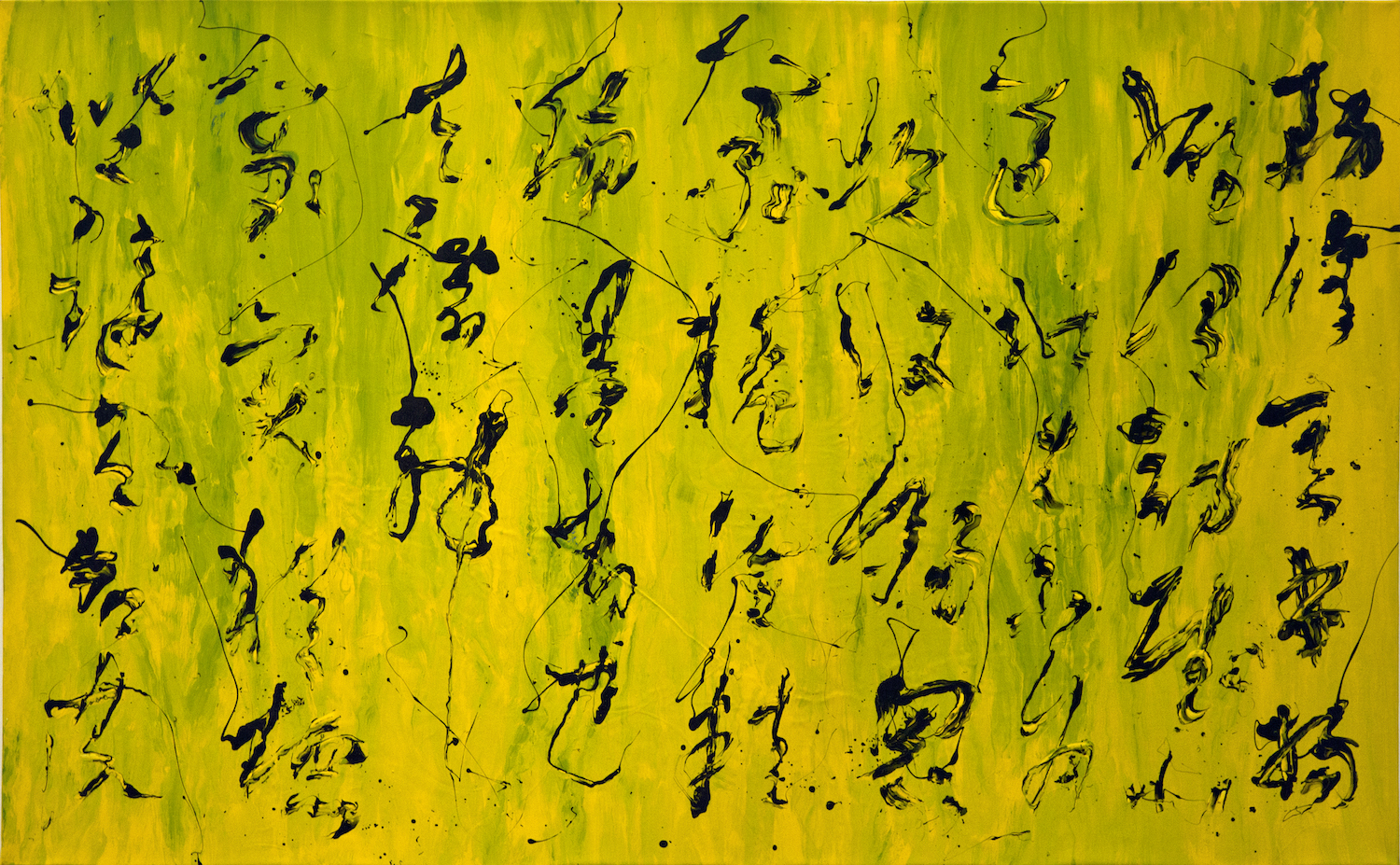 在油画布面先以黄色和绿色待油漆作底,趁底色油漆未干时,使用特制的油漆刷,蘸以黑色油漆泼溅于画面并书写内容如下:“务修其本,杨雄谓:‘诗赋小道,壮夫不为。’况复溺思毫厘,沦精翰墨者也!夫潜神对弈,犹标坐隐之名,乐志垂纶”。(文字内容出自[唐]孙过庭《书谱》)
