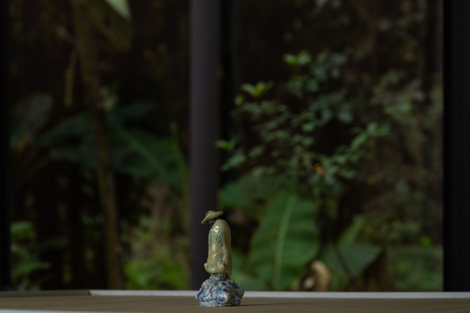 津田久美惠的创作里经常出没的精灵一般的形象,它们就像日本传说里那些散落在自然各处的神灵的化身。可能无限小,蛰居在树丛里或屋檐下,静候着行人的一瞥;也可能无限大,高大如山峰,广阔如湖泊,日光倾洒在其身上再沿着瀑布闪烁流落,而上山的行人在不知不觉中见证一场自然而发的祭典。久美惠为她的一些作品构思创作的木构基座,对于基座的板块的色彩,她专门从日本的传统色中挑选了十余种,如:滅紫、錆浅葱、桔梗納戸、紅湊、栗梅、媚茶、晒柿等。这些低饱和度的块状色彩,犹如日本庭园里透过门窗看到的,被切割成矩形的色彩隐晦的园景,隐隐唤醒观者对自然的某种动态的记忆。这样悠远的记忆,也牵过观者的思绪使之摒弃浮华,委身坐入一场静默,以谦卑的姿态,和这些似人而非人的精灵形象一起,等待某种可能的诞生。