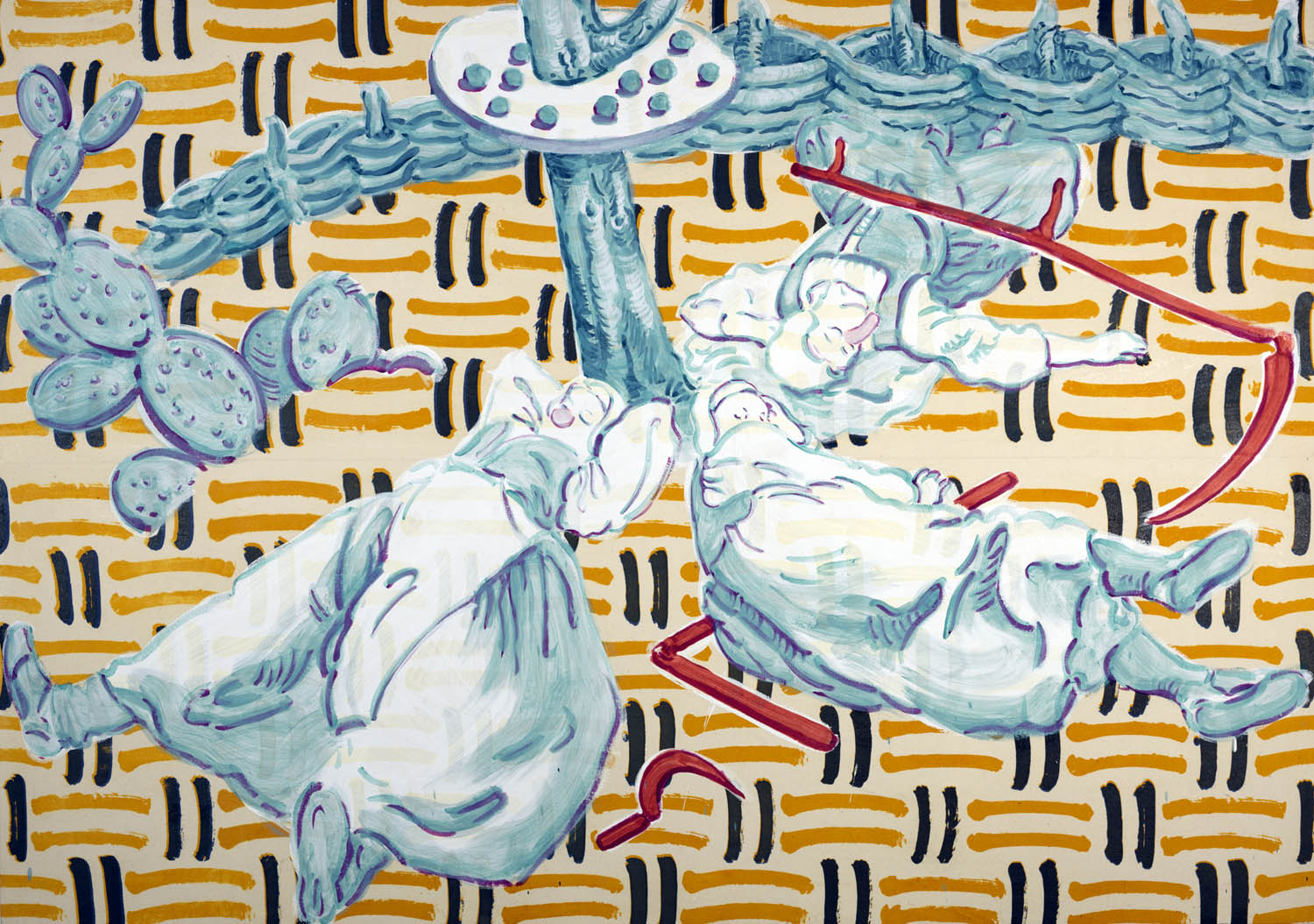 由菘蓝制成的玛雅蓝、胭脂虫、茜草和石膏,绘于用染料木和苏木染制的丝网印花布,裱于木板,120×170cm,2017年