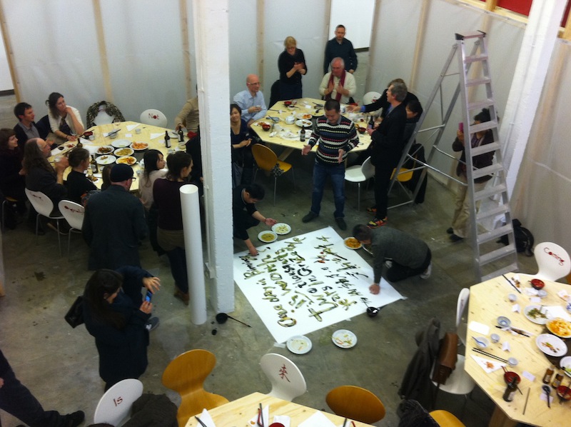 在纷乱和迷失的社会情境中,阳江组的书写往往成为具有某种现实隐喻的图示,来暗示生活中的不可预测性和某种“玄机”,这里没有一个确定的元素和形式,形式每常每新,书法可以无所不在地和各种异质的社会行为结合起来,新闻、搏彩、足球、大甩卖…….在日常、酒、茶和话语的共同发酵中,时间和材料转化成整体的书法情境。例如,《饭后书法》将平常饭局转化成为在公共空间观看与被观看的即时剧场,局中食剩的食材直接用于书法,“书食同体”,以声东击西的方式展开个体精神性与物质性世界间的关系实验,而其中书写的内容往往成为体察和参透整个发生过程中人类行为和世界关系的偈语。