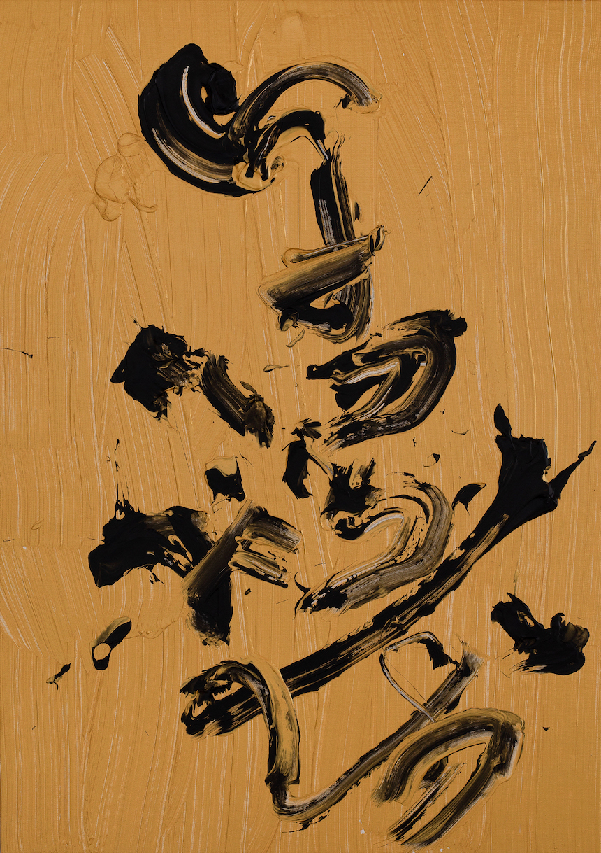 在油画布面先以金色丙烯颜料作底,底色尚未干透时,使用特制的油漆刷,蘸以黑色丙烯颜料书写内容如下:“自心祖师”。