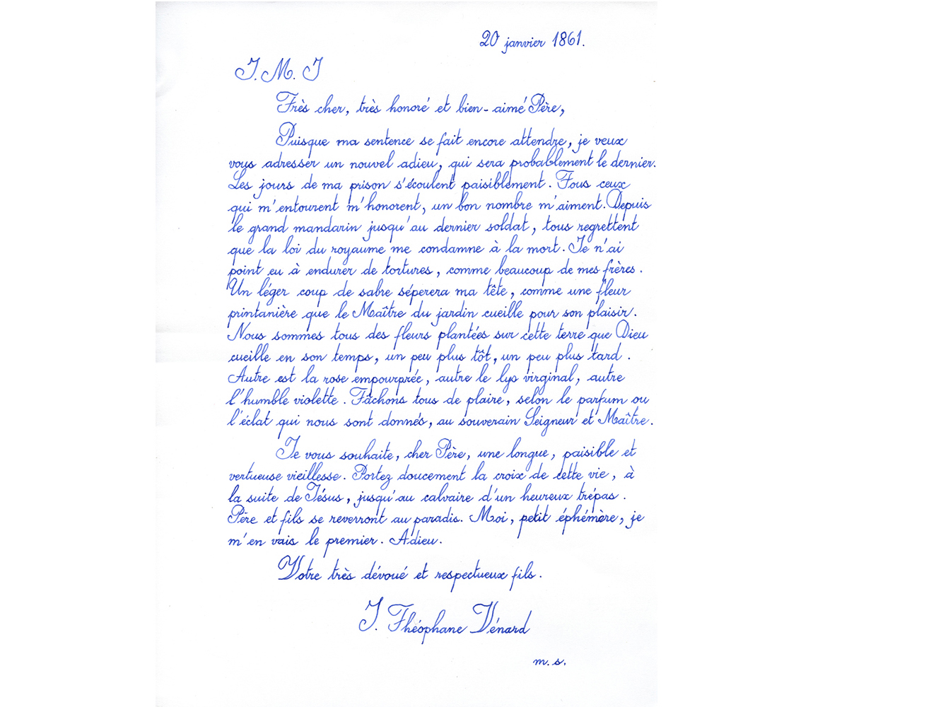法国传教士圣戴法纳·韦纳尔在殉道前写给父亲的最后一封信