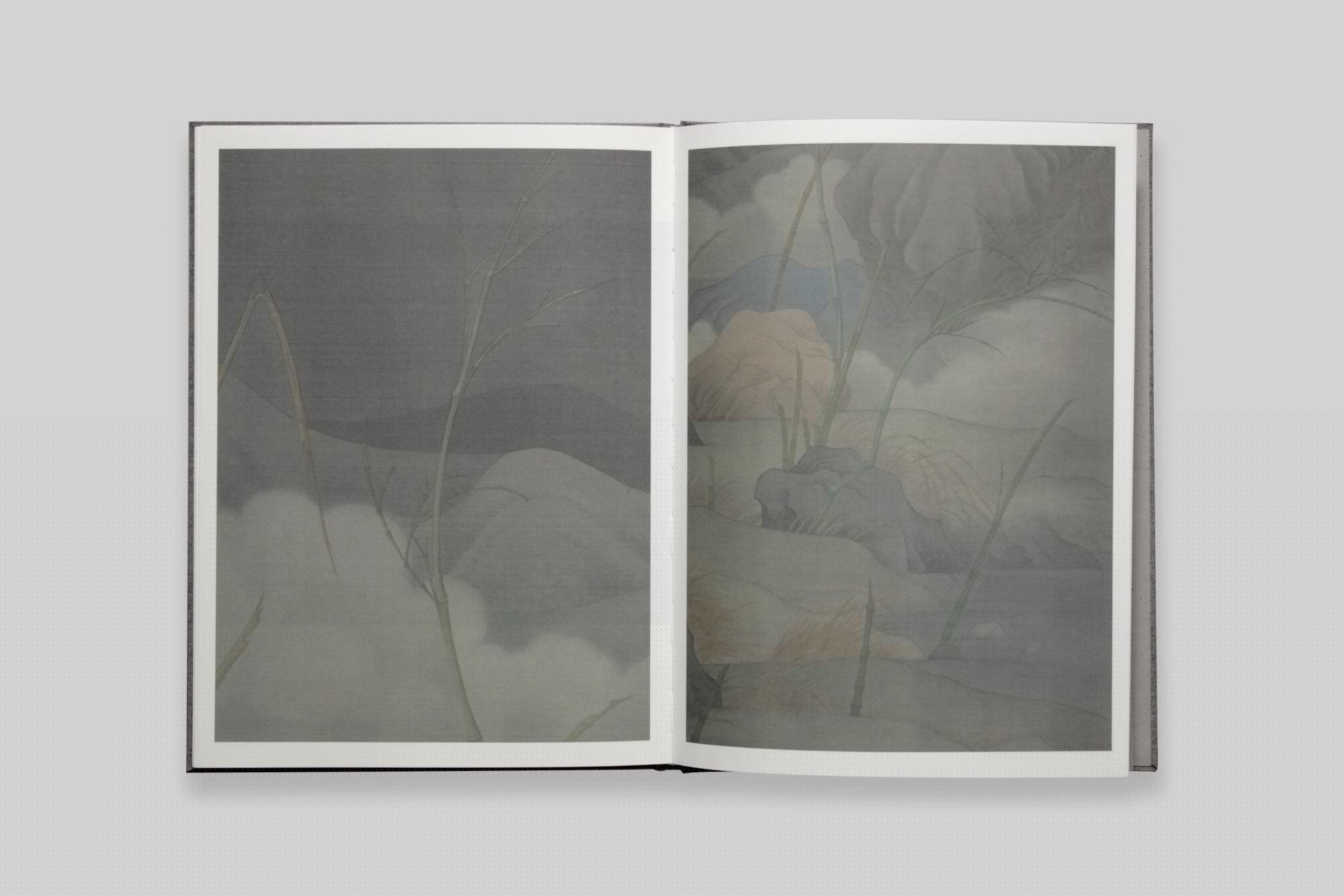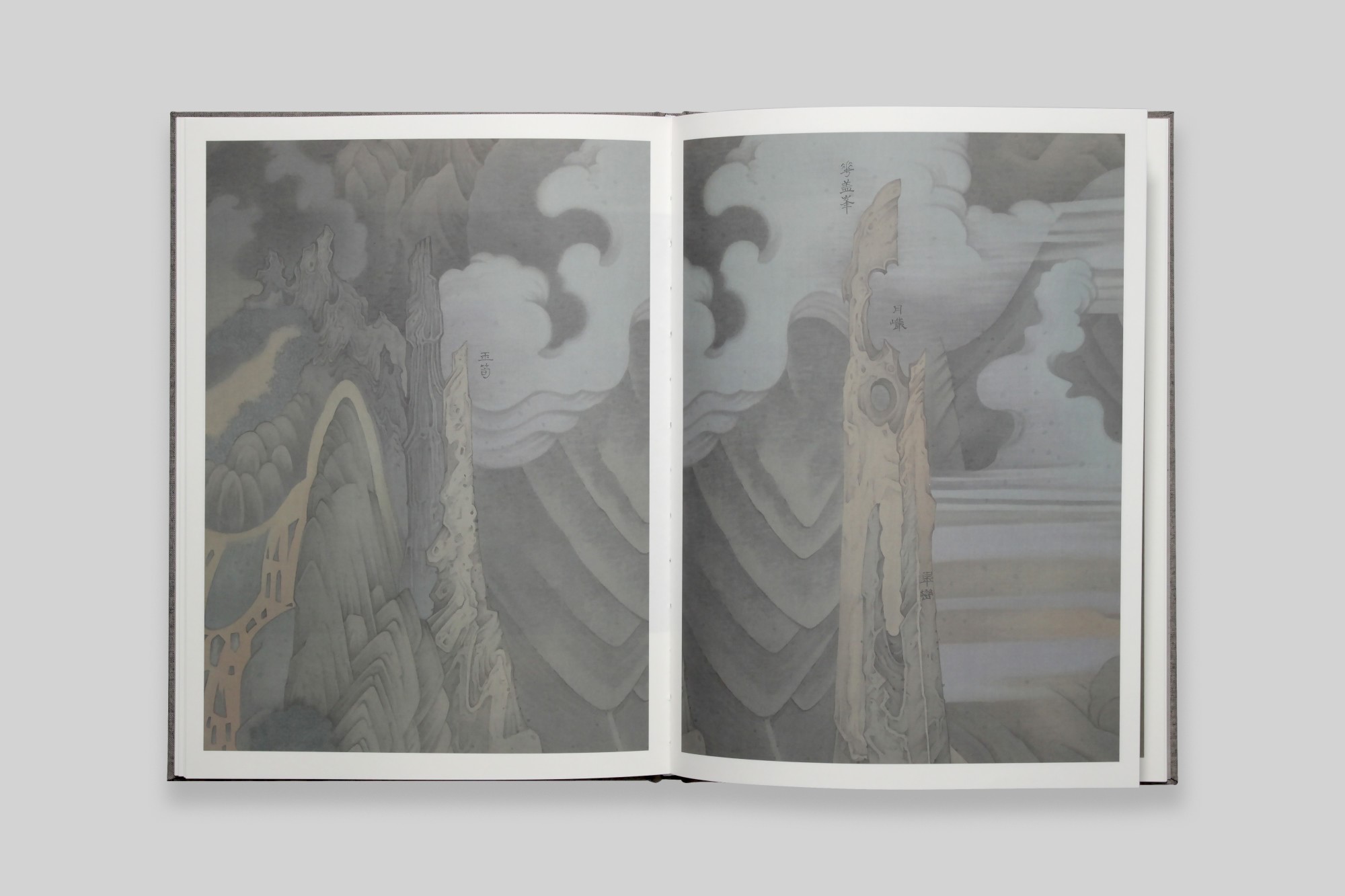 图册部分收录了郝量以“潇湘八景”为题材而创作的八件大尺幅绢本水墨绘画,以八个不同的切入点为观众构建出一个古今交织的山水时空。“潇湘”的概念不仅在古代文学中常有互文,亦自宋代以降就成为贯穿多朝绘画的母题,并传播影响至日本与韩国,历代名家如牧溪、米芾、董源、文徵明等皆创作过该主题的绘画。郝量选择再绘“潇湘”,然而他笔下的“八景”和以往大有不同,古意盎然而又荒诞诡谲,仿如一个个跨越时空的山水魔方。