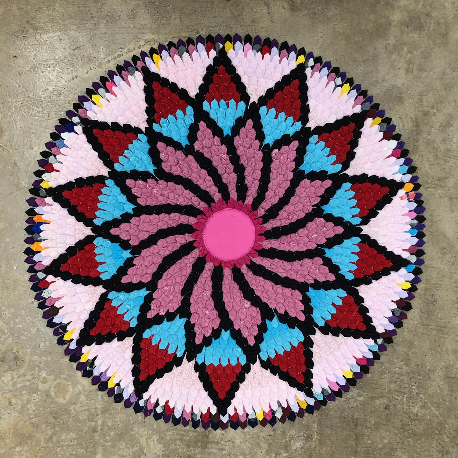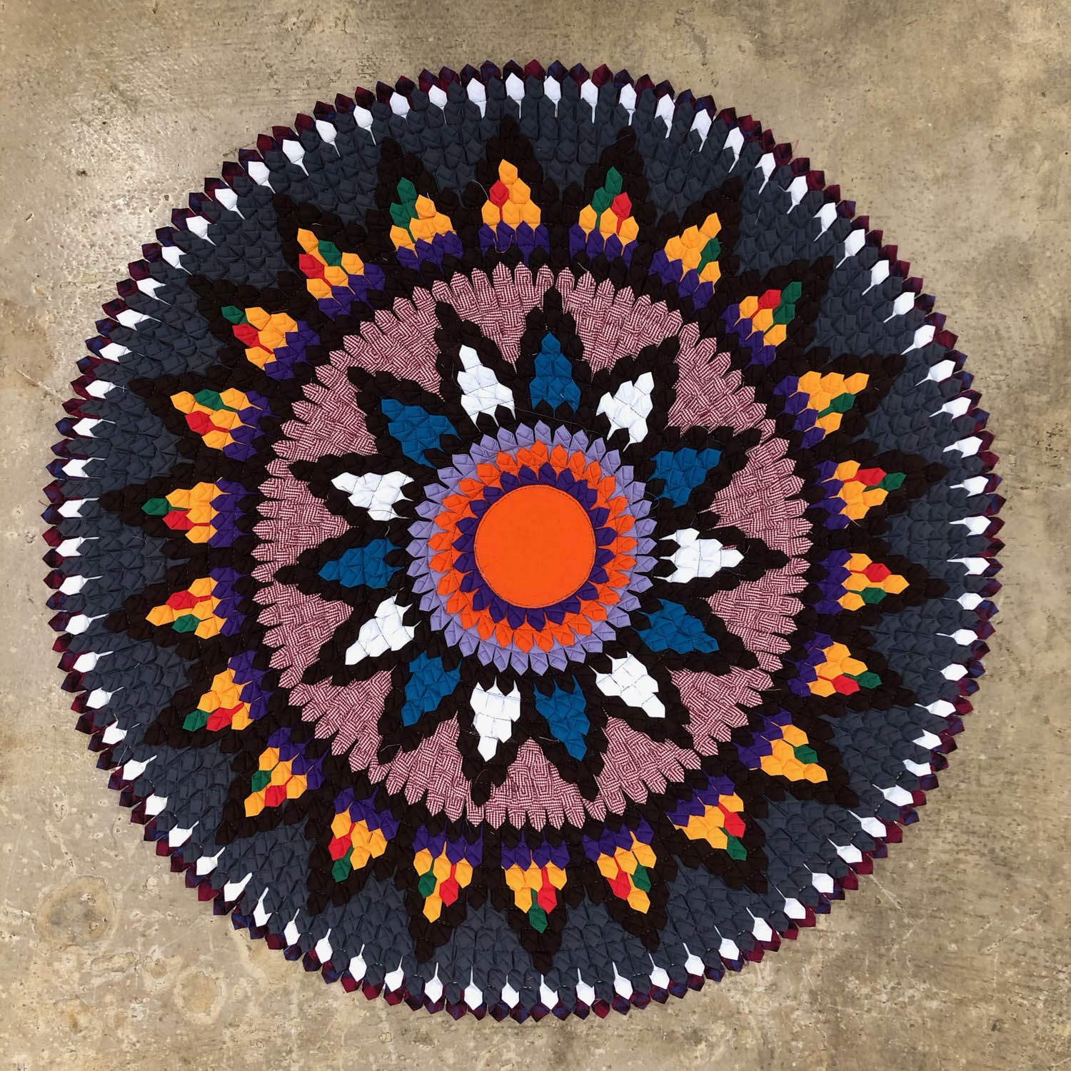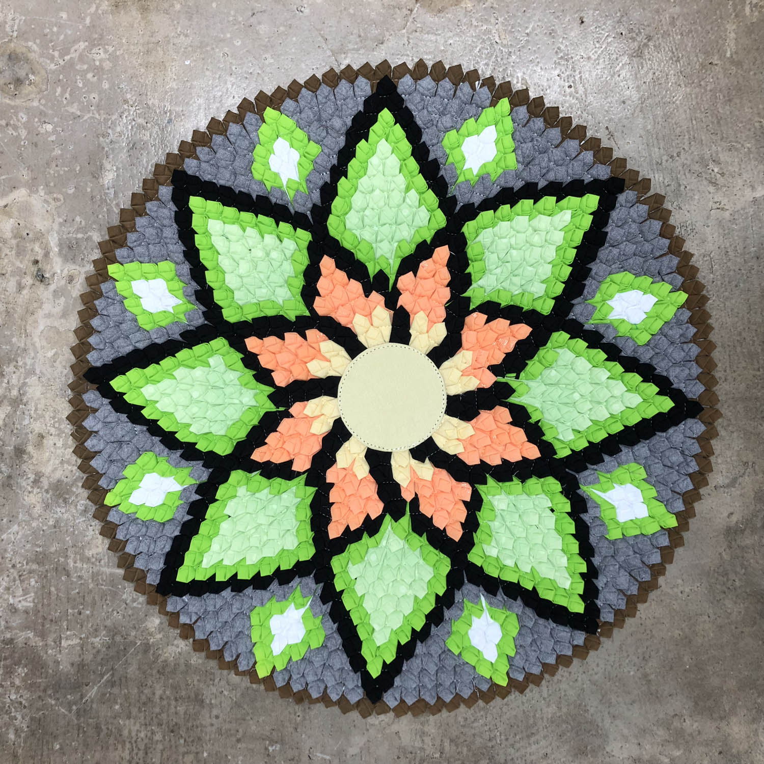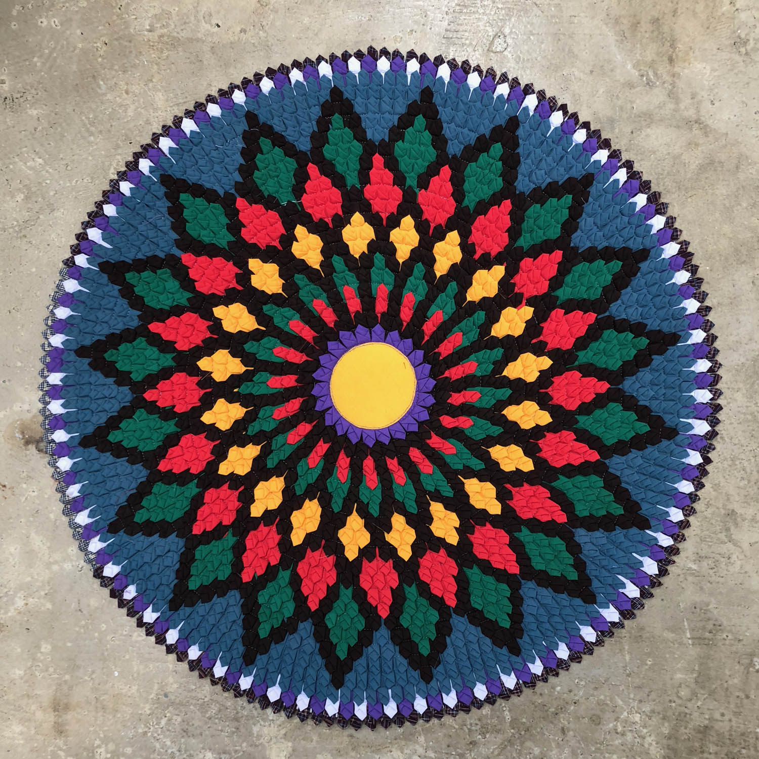 这些泰国的小垫子,由不同颜色的边角布料缝制成的图案是曼陀罗(Mandala)图式,构成图案的拼布采用了同一种折布的方式,不同颜色的拼布构成了图案中的背景色和主体;垫子的背面则是把拼布缝制在一起作为支撑层的羊毛毡。