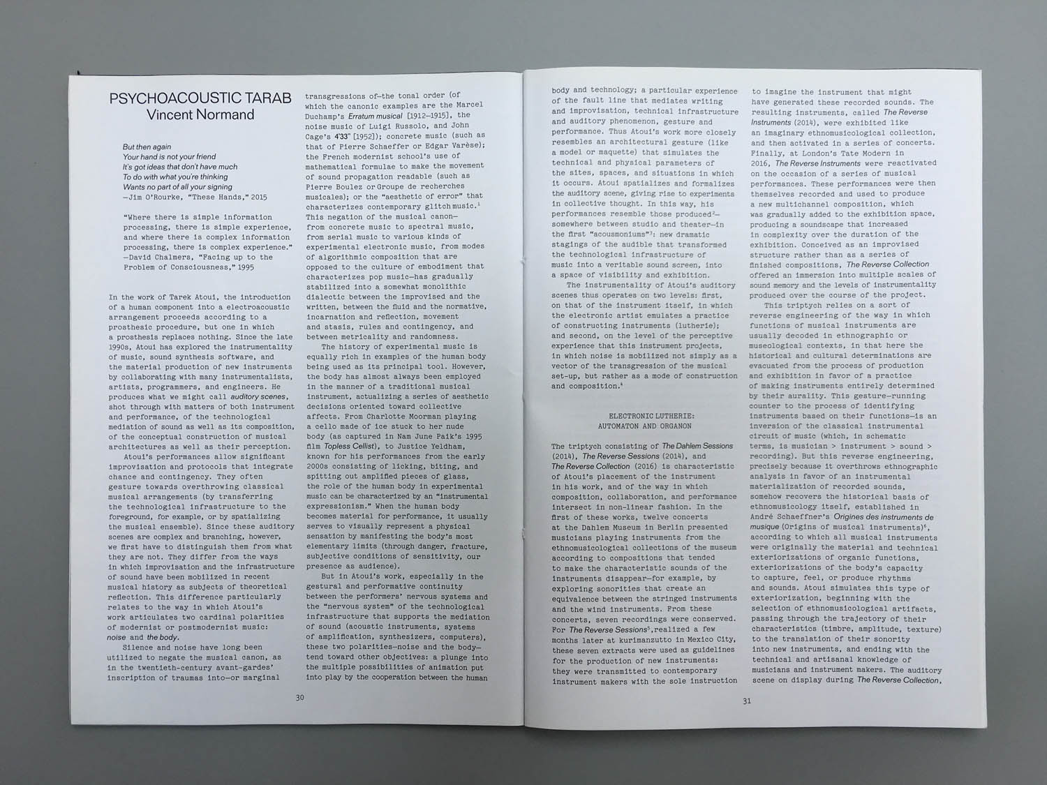 《Tarek Atoui: The Reverse Sessions / The Reverse Collection》一书反映了塔里克·阿图伊围绕 “The Reverse (反转)”这一系列创作的整体历程,包括了三部曲般的三个相关过程:“The Dahlem Sessions (达勒姆会期)”和“The Reverse Sessions(反转会期)”,以及“The Reverse Collection(反转收藏)”,后者是塔里克·阿图伊为泰特现代美术馆构思的三部曲系列作品中最新也是最终的一章。