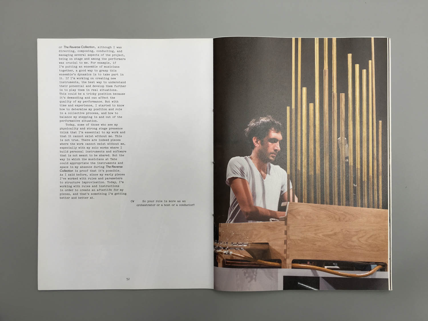 阿图伊的这三段流程反转了乐器制造通常而言的顺序——声音异乎寻常地成为了起点。在泰特美术馆发生的最后阶段中,这个声音项目在物体、表演、声音之间产生的新的可能性和新的关联成为创作的真正成果。
