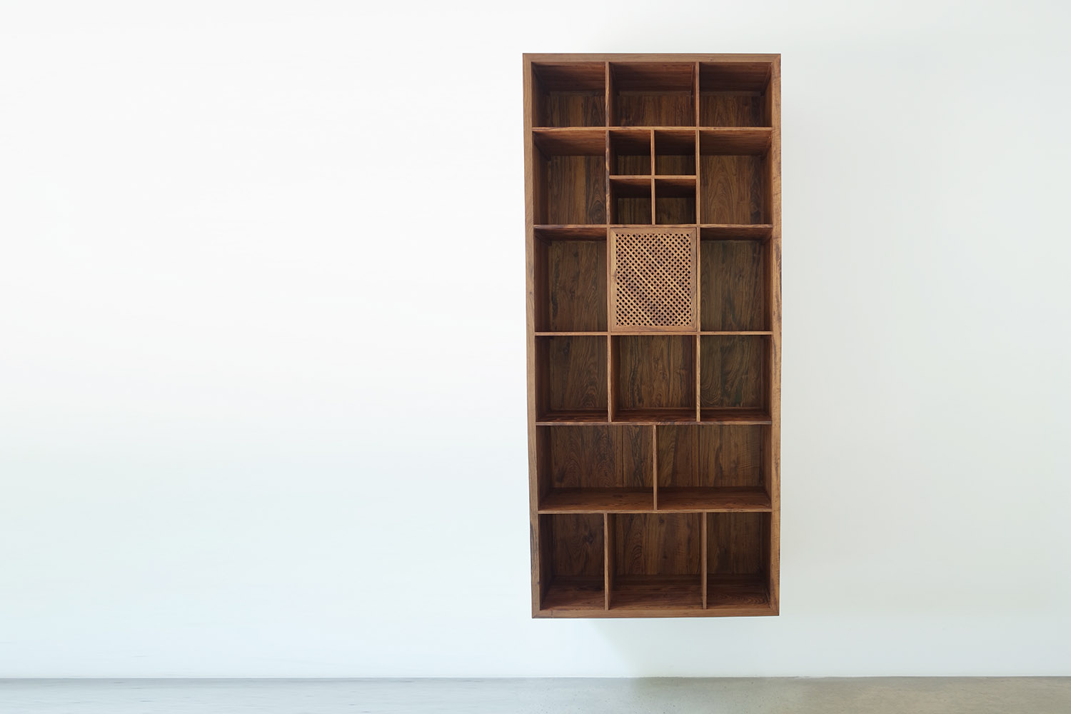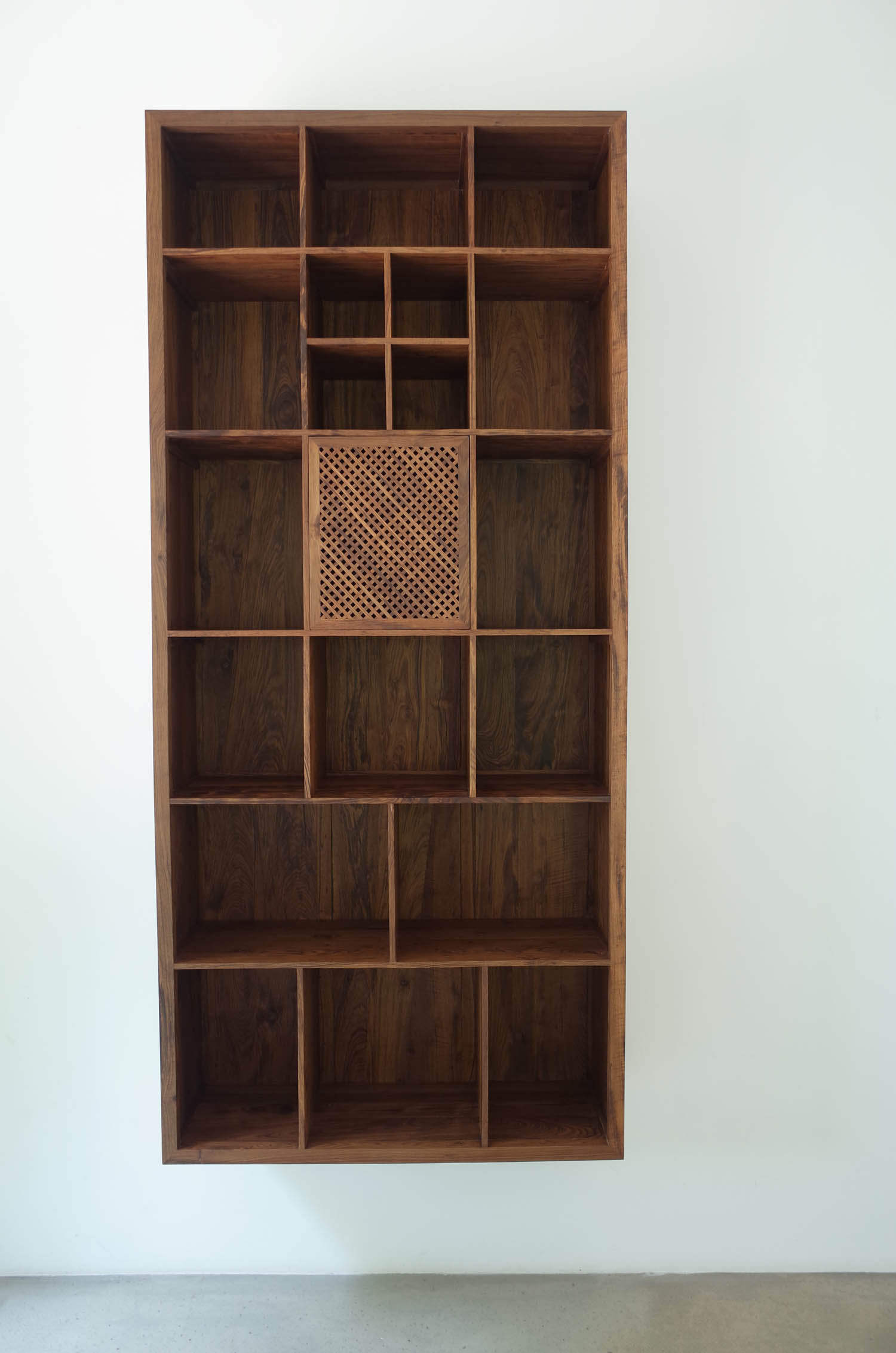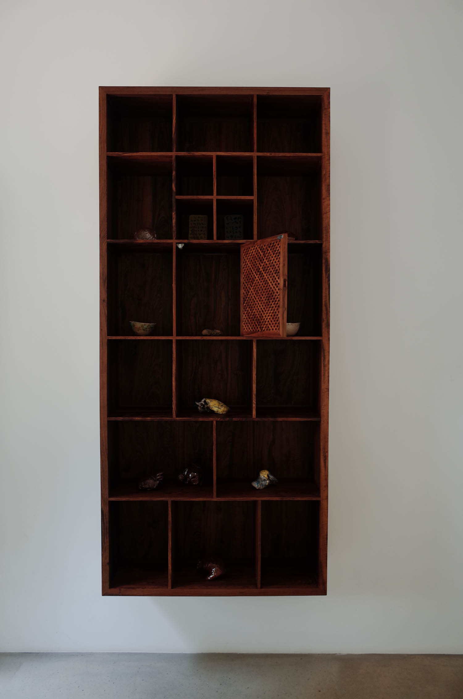 它悬在墙上,不着地不近尘埃,免去了着地那部分低矮空间不方便取拿观看的问题;也因此,它出尘脱俗,气格更高,也方便人可整体上聚焦观赏这一格子空间。