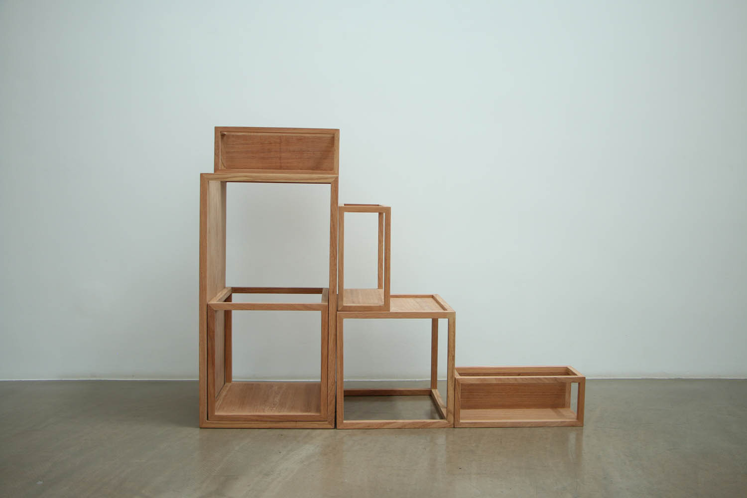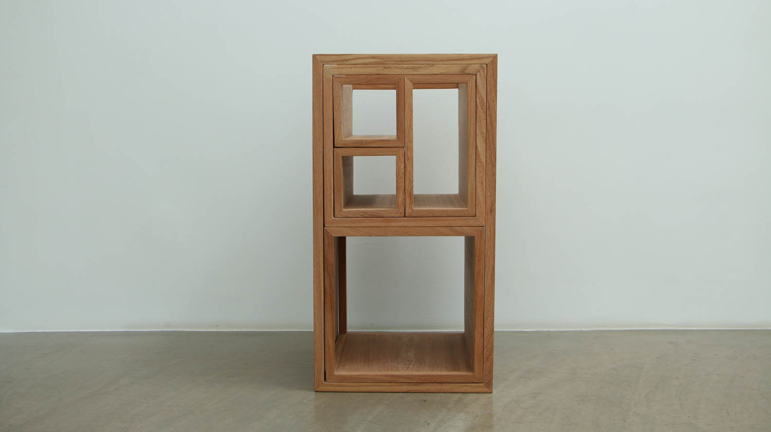 “+−”物架是由一大二中三小的六个部件组成的、不限定为一种组合使用方式的木制家具空间。