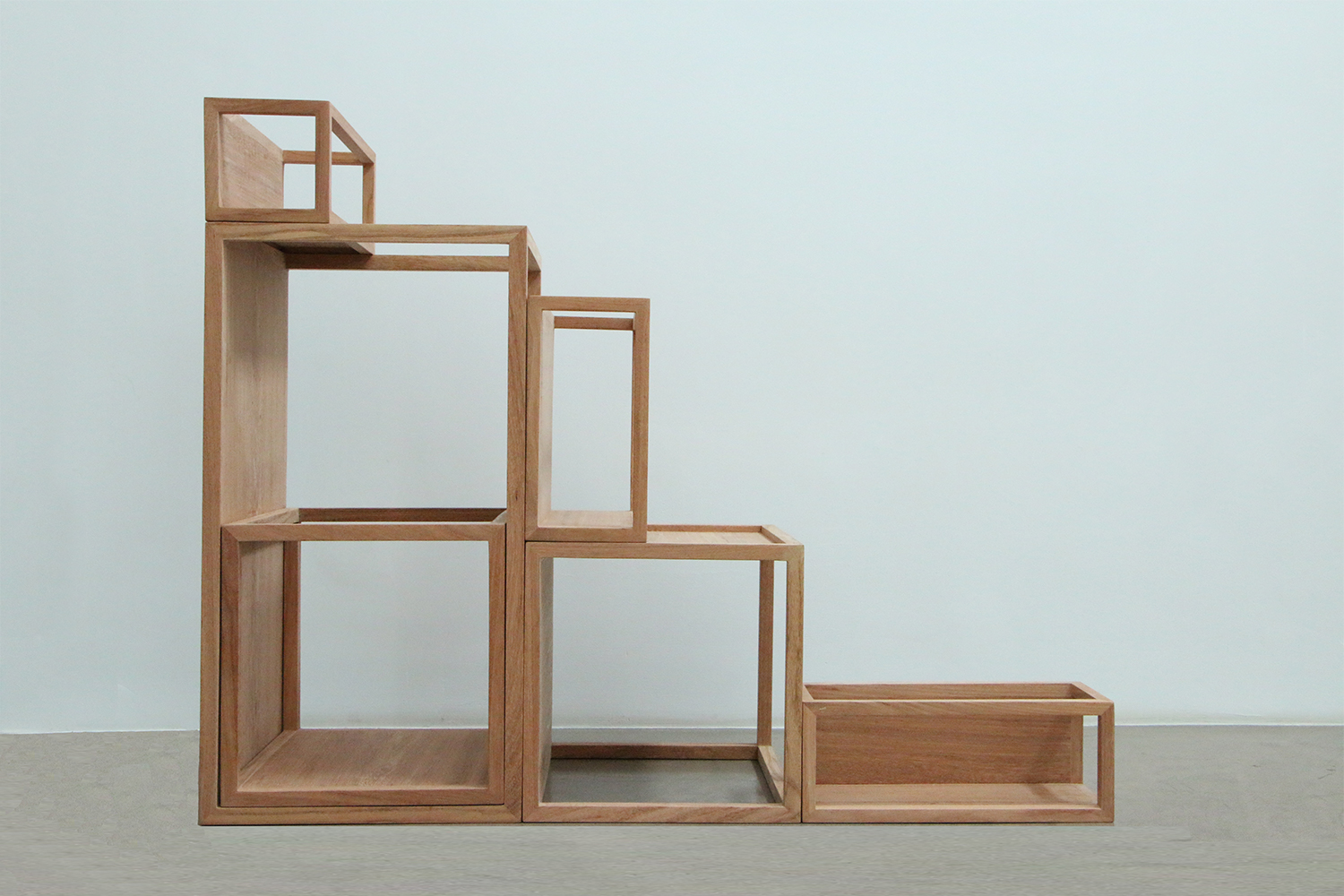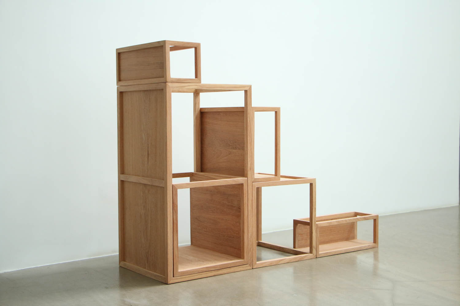 它有三个显著特点:运用了模件思想,通过部件的加减组合来完成空间结体;每个六面体部件,只有成垂直相交的两面为实面,从部件到整个物架,形成了对正/负空间的使用与纳入;六个部件粗略可分为大中小三类,小的可叠入更大一号的里边,它们既可是内含的关系,又可相互独立使用,是可收叠型的家具空间。