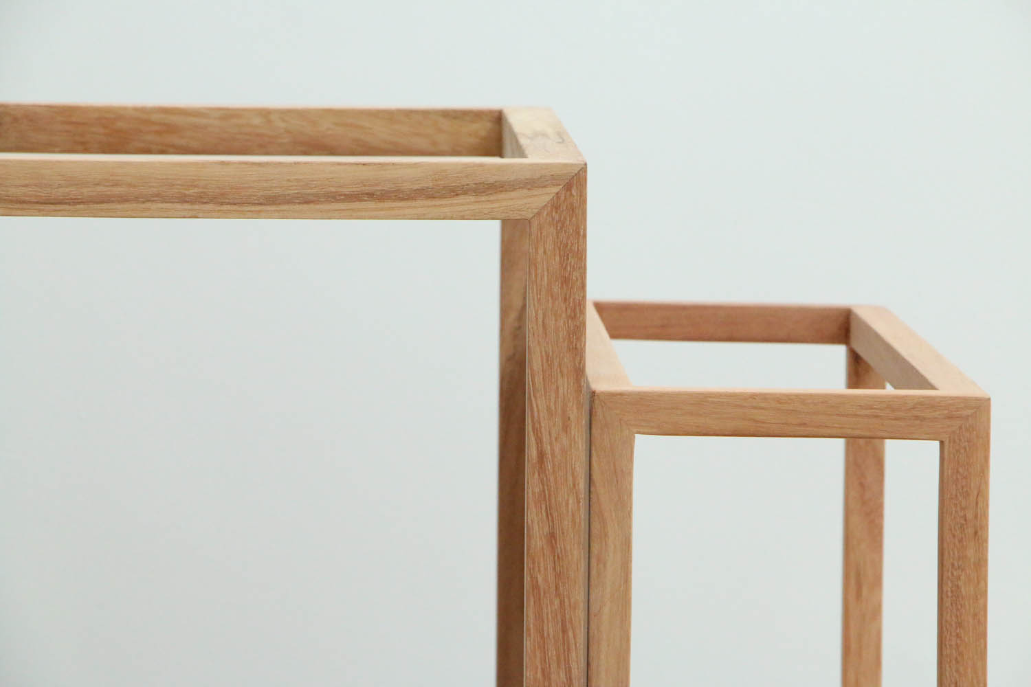 “+−”物架采用了传统的榫卯工艺,比如:粽角榫等,让结体更为稳固,框架形态的骨架感也浮现出来。“+−”物架所用木材为缅茄木,质地坚硬、耐腐耐酸性好,木色为褐色至红褐色,木纹的纹理交错,制作打磨后光泽益显。“+−”物架为呈现木材的本来面貌和让木材自由呼吸,未打蜡或上漆,在使用时请避免留下烫印、水印、或其他污渍浸痕。